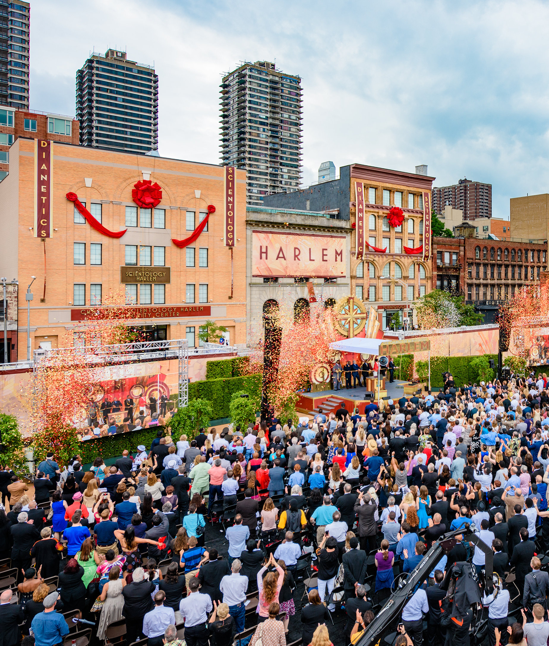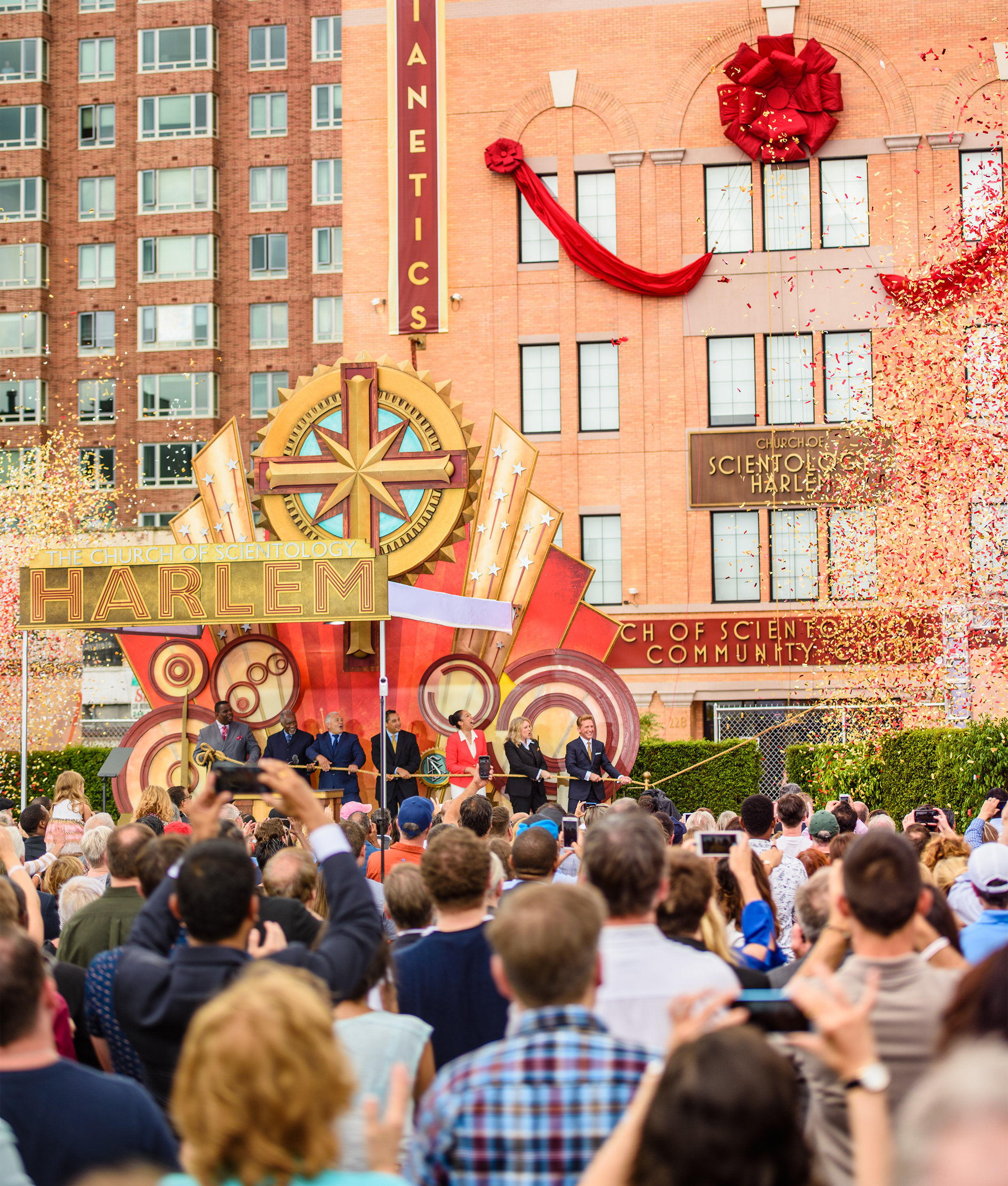 Sur quoi, M. Miscavige a été rejoint par un ensemble de dignitaires, il a tiré la corde qui a fait tomber le ruban de l’ouverture officielle de la nouvelle Org idéale et du centre communautaire comme la foule scandait : « Harlem, Harlem, Harlem ».